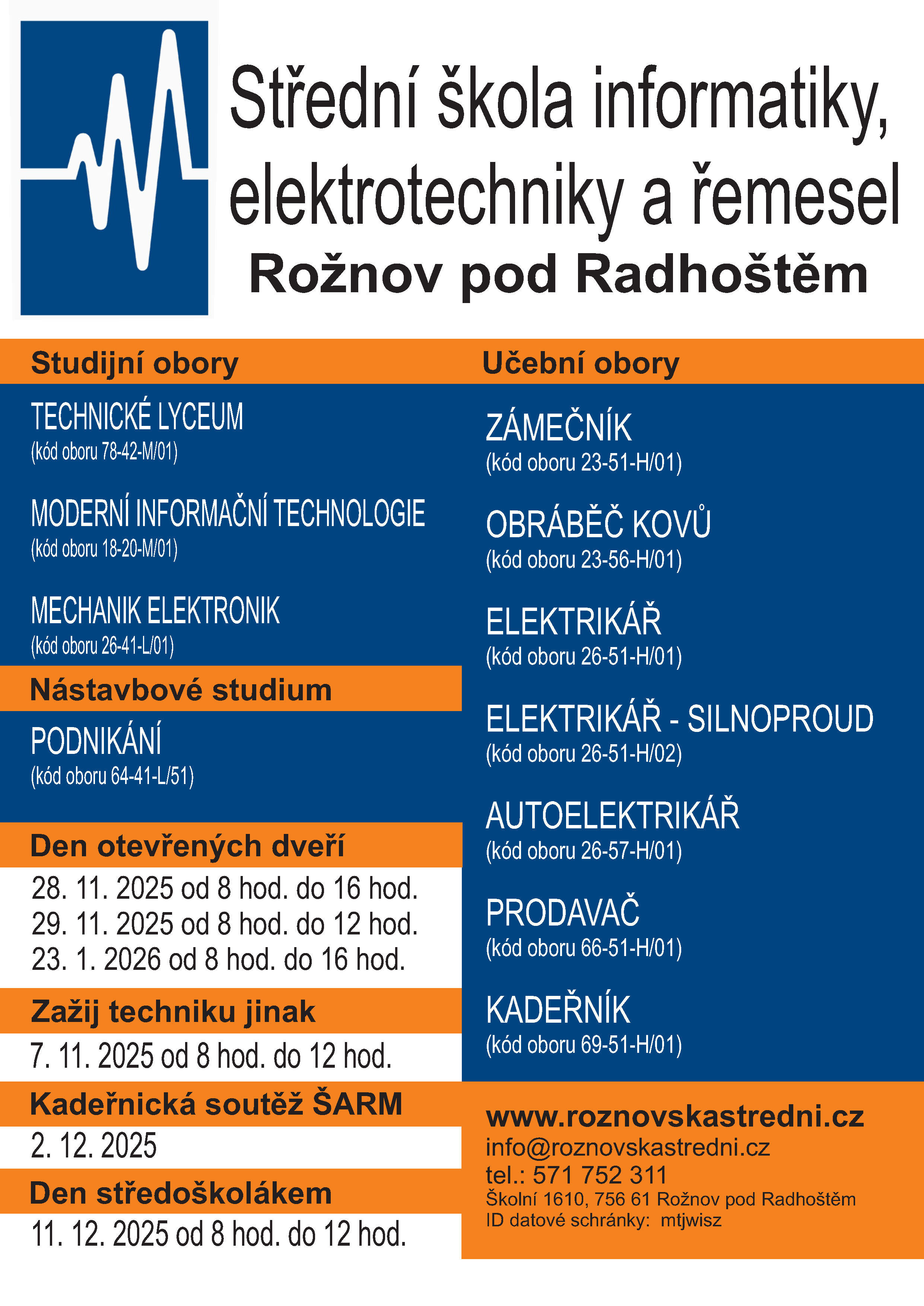Termíny akcí Den otevřených dveří, Zažij techniku jinak, kadeřnická soutěž ŠARM, Den středoškolákem